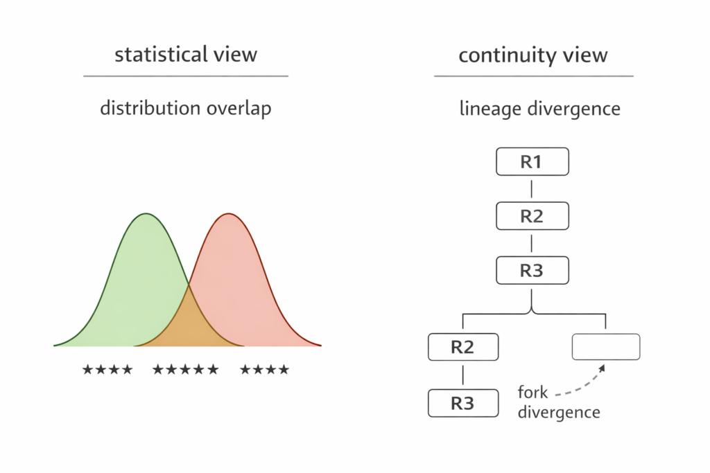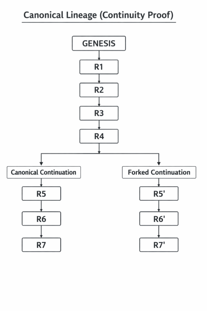 Only the continuity of state transitions through time — the canonical lineage — establishes identity.
